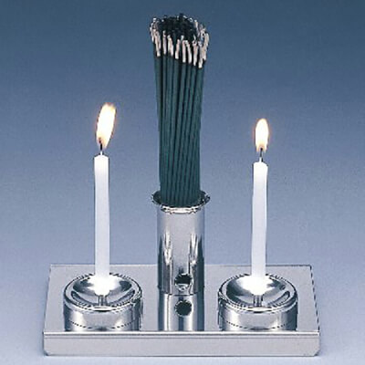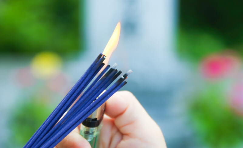 束になったお線香ひと束をバラにすることなく、そのまま頭に火を灯し、煙が立つようになったら、お線香用の定位置に立てます。