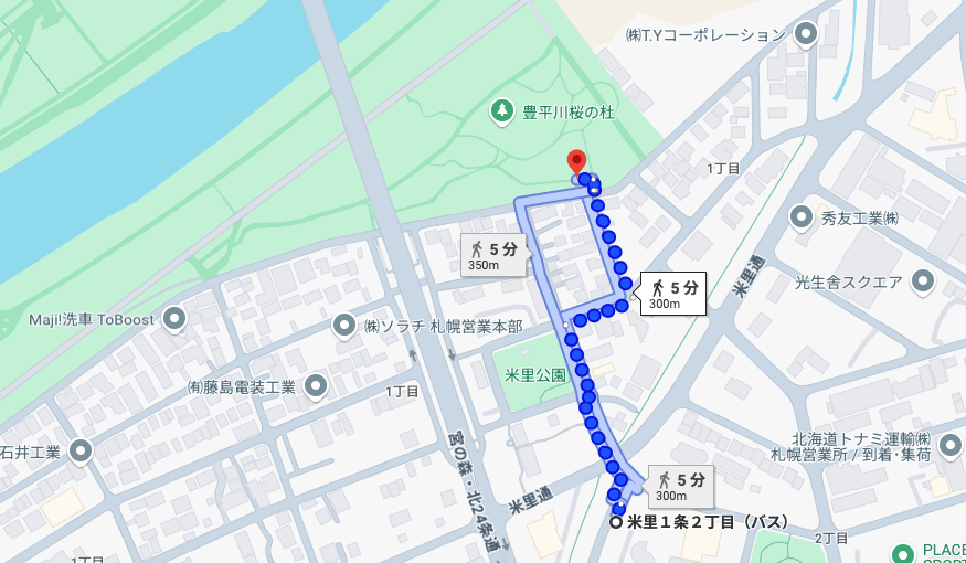 ※米里1条2丁目でバス降車後、桜の杜までの距離は300m、徒歩5分の計算。