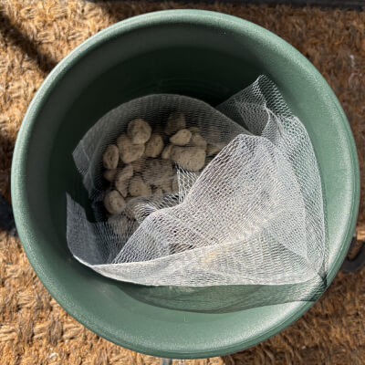 鉢底石を台所排水溝用の網に入れて、敷きます。